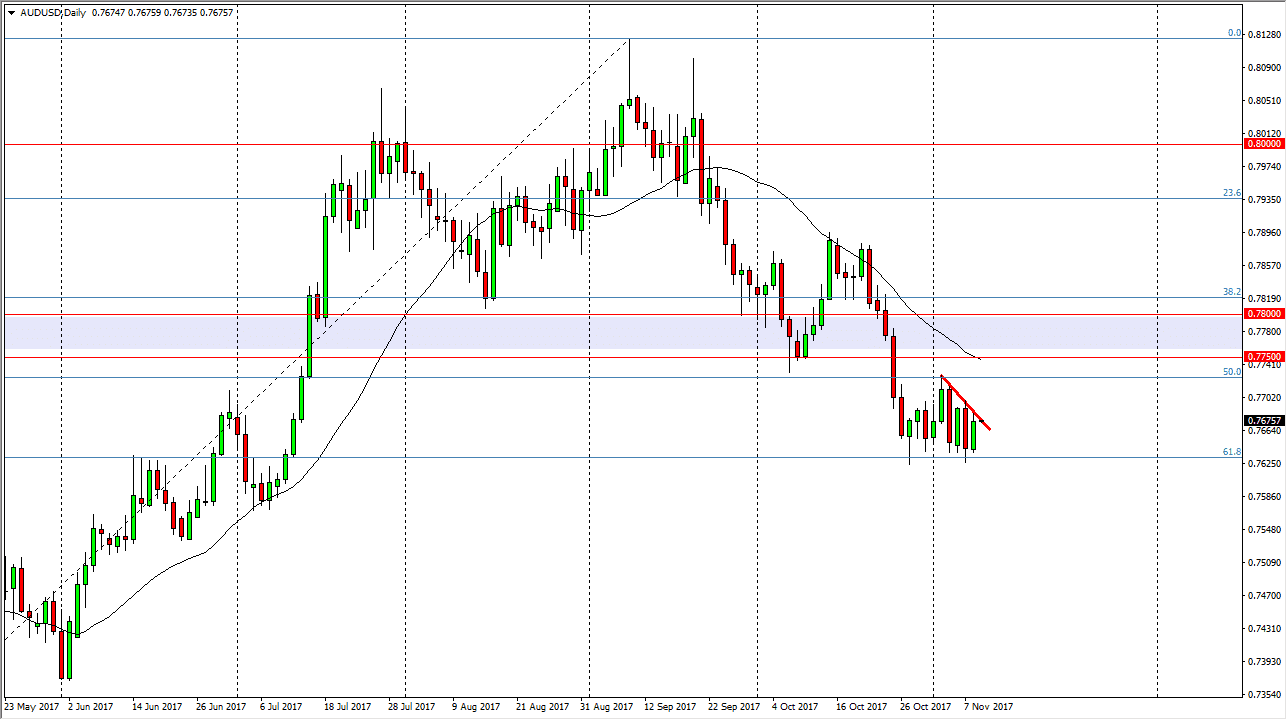 The Australian dollar tried to rally during the day but continues to struggle with a downtrend line. Even if we break above there, I think there is more than enough resistance above, and extending to at least the 0.78 level to keep the market lower. If we break down below the 0.7625 handle, the market probably goes to the 0.75 level given enough time, because of the 61.8% Fibonacci retracement level breaking down. Overall, I believe that the Australian dollar will continue to struggle, because even though we have seen a bit of strength in the gold market, there is still a massive amount of resistance above and that market as well. I believe in selling rallies, and it’s only a matter of time before we get an exhaustive candle that we can take advantage of. It might even be a market that you need to look to short-term charts to trade.