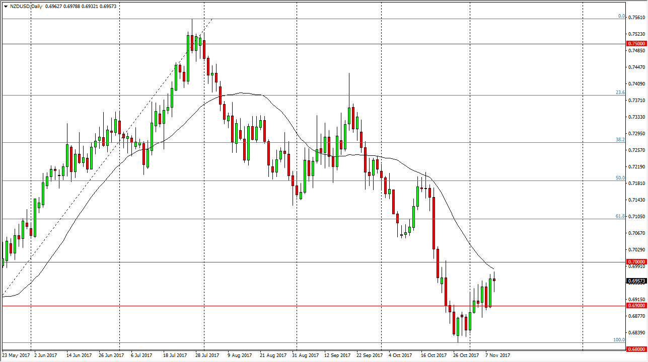 The New Zealand dollar went back and forth during the day on Thursday, as we are hovering around the 0.6950 level. The 0.70 level above should be resistive though, because it was the scene of the 2nd leg lower on the most recent move, but of course it is also a large, round, psychologically significant number. Ultimately, the market should find enough selling pressure to roll over towards the 0.68 level, unless of course there is a sudden surge in commodities, something that I don’t see happening beyond the oil market. I believe that the New Zealand dollar was a bit oversold after the surprise election, but quite frankly higher spending out of Wellington will continue to concern people, and this should continue to weigh upon the value of the kiwi dollar overall. Beyond that, if the Federal Reserve continues to look likely to raise interest rates, and makes sense that we would fall as well.