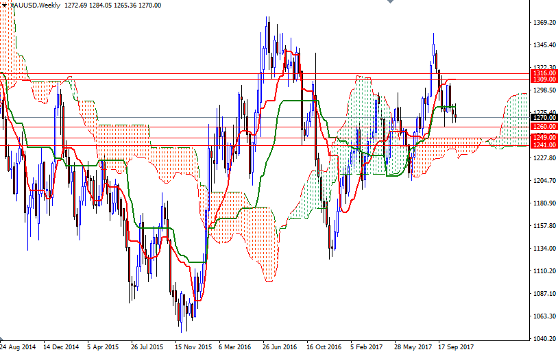 Gold prices settled at $1270 an ounce on Friday, suffering a loss of 0.24% on the week, as expectations of tighter monetary policy in the U.S pushed the dollar higher. The Federal Reserve was more upbeat about recent economic developments. Recent data continued to suggest that the world's biggest economy was still is on a solid growth path, though concerns about low inflation persisted. The dollar index posted its third straight weekly increase and the major U.S. stock indexes closed the week with records.