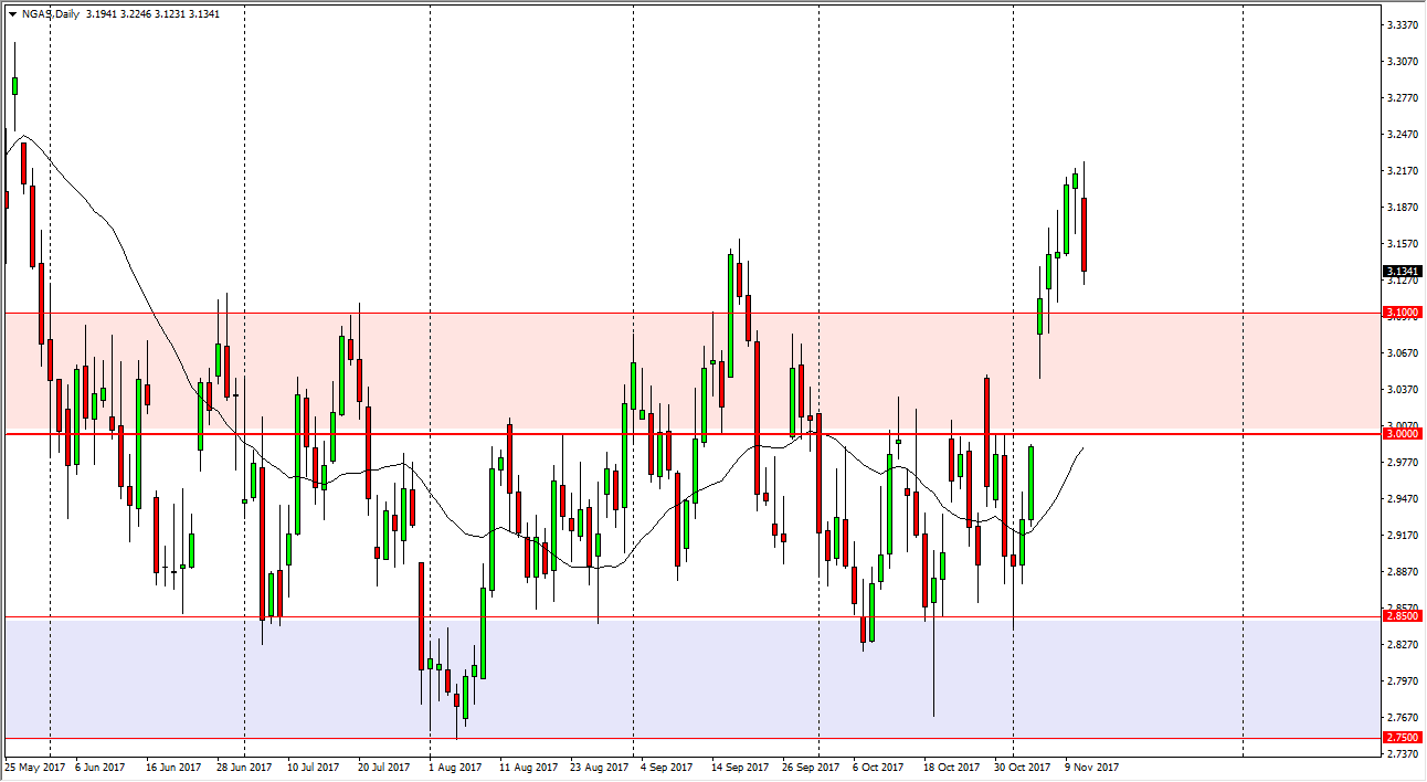 Natural gas markets had a very negative looking day on Monday, wiping out well over a dime. Because of that, I think that we are going to go down to the $3.10 level, possibly even lower than that, we might even end up filling the gap, meaning a move back down to the $3 handle. I suspect that we will still have buying pressure though, because quite frankly we have broken through some major barriers in the last couple of weeks. Seasonality suggests that natural gas market should go higher, at least until the end of the year. That doesn’t mean that we won’t get violent pullbacks occasionally, obviously we well. However, I think that the market should continue to be volatile, so being patient is going to be absolutely necessary. I don’t like natural gas in general, but over the next couple of months it historically will do well.
