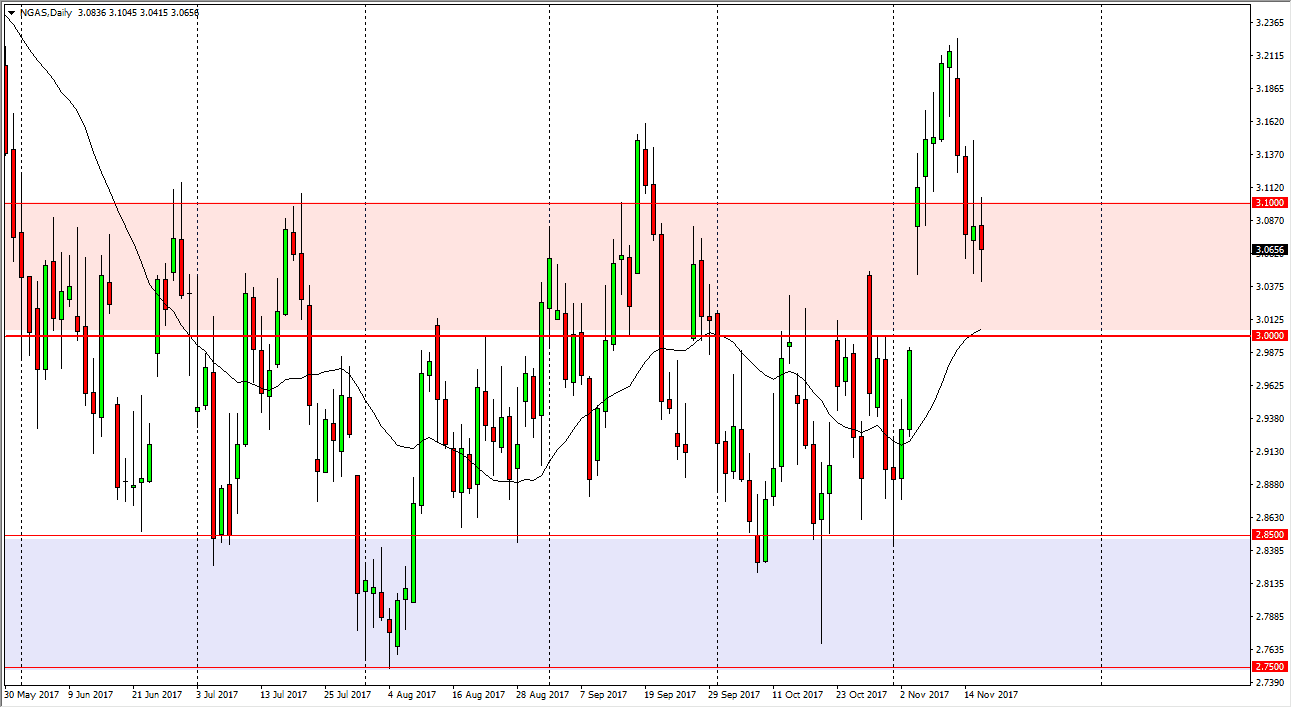 The natural gas markets continue to be very noisy, forming a slightly negative candle. It looks as if we are trying to fill the gap, which extends down to the $3.00 level. That is an area that should be supportive, and eventually we should find support in that area and more importantly, buyers. That should have the market turn around and looking to go to the upside as the seasonality of the natural gas markets favors buying. The colder temperatures in the United States should drive demand and the short-term, but it is going to take some doing. If we can break down below the $3.00 level, the market probably falls apart at that point. If we can break above the $3.10 level before that, I would be convinced that we have found enough momentum to go ahead and jump into the market there also. A breakdown below the $3.00 level is catastrophic.