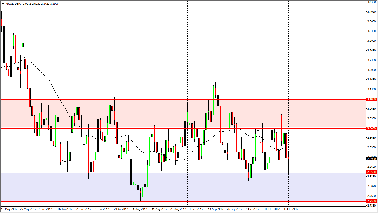 The natural gas markets initially fell during the trading session on Wednesday, but bounced from the 2.85 level to show signs of support and form a hammer. As you can see on the daily chart, I have a “buy zone”, and a “sell zone” marked by a light red and then a purple rectangle respectively. We are currently looking likely to rally from here, but I think this is short term as the overall consolidation should continue. The market is going to deal with oversupply every time we get to the $3 handle, because quite frankly US franking companies are up to their ears in natural gas. Because of this, I think range bound traders are going to continue to do quite well in this market.