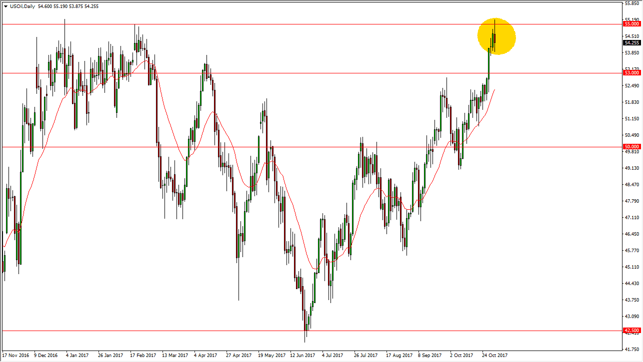 The WTI Crude Oil market tried to rally during the session on Wednesday, reaching towards the $55 level. The area caused enough resistance to turn the market around and form a bit of a shooting star. A breakdown below the bottom of the shooting star should send this market looking for the $53 level, which was massive resistance, but should also be supportive. Because of this, I think we’re going to get a bit of a short-term selloff, but I think that the buyers will probably return and this area, and that I think that the market breaking down below there would be very bearish, perhaps sending us to the $50 handle. There are a lot of mitigating factors right now, but the easiest thing to come to terms with is that the market is overextended, so a pullback makes perfect sense. If we do break above the top of the candle for the session on Wednesday, it would become a very impulsive and bullish move.