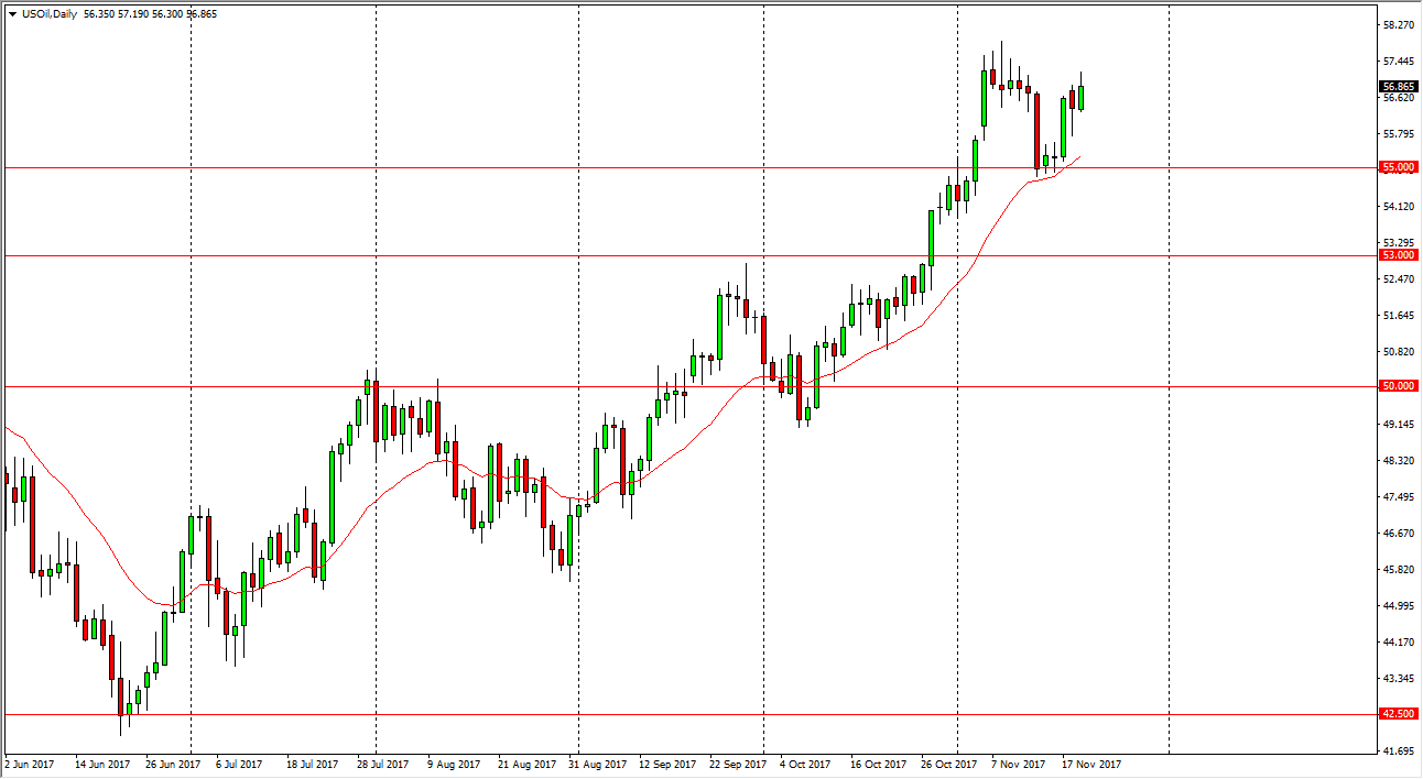 The WTI Crude Oil market rallied on Tuesday, breaking the top of the hammer that was formed on Monday. This is a very bullish sign, and it looks as if we will try to break out above the $58 level next. Once we do, the market will almost certainly go looking towards the $60 level above, which is a large, round, psychologically significant number, and it is of course structurally resistive in the past as well. I believe that the $55 level now acts as a bit of a floor in the uptrend, and that short-term pullbacks will offer value the people are willing to take advantage of as the tensions in the Middle East rise. Longer-term, I believe that there is far too much in the way of supply and of course threats from North America drilling to allow the market to stay elevated for too long.
