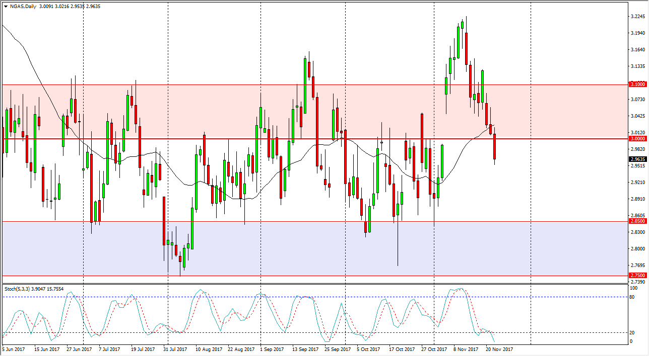 Natural gas markets fell hard during the day on Wednesday, slicing through the $3 handle. By doing so, they not only filled the gap during the session, but broke down below it. That’s a very negative sign, and it’s likely that we will continue to fall towards the $2.85 level. Ultimately, the fact that even during the seasonally strong time of the year natural gas can break down through a gap, it’s likely that we will continue to see a lot of selling pressure. This is catastrophic from what I can see, and I think that rallies continue to be selling opportunities at the first sign of exhaustion. If we did break above the $3.10 level, at that point I think the buyers would come back but I must admit I am rather surprised that the rally had failed so catastrophically, and I believe that the natural gas markets are only getting more dangerous, not less.