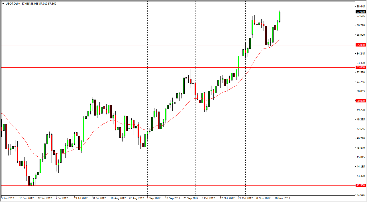 The WTI Crude Oil market rallied significantly during the trading session on Wednesday, reaching towards the $58 level again. The $50 level course has been resistive in the past, and the fact that we are closing right around that level is a good sign. However, the futures market will be thin electronic trading at best over the next 24 hours, so I think that we have the potential for volatility. Pullbacks should be buying opportunities, especially considering how much tension we are starting to see in the Middle East, and the potential troubles between Iran and Saudi Arabia should continue to put upward pressure on the market. Longer-term, it’s likely that we will have plenty of seller’s above, as once pricing gets high enough, the American start flooding the markets with more drilling.