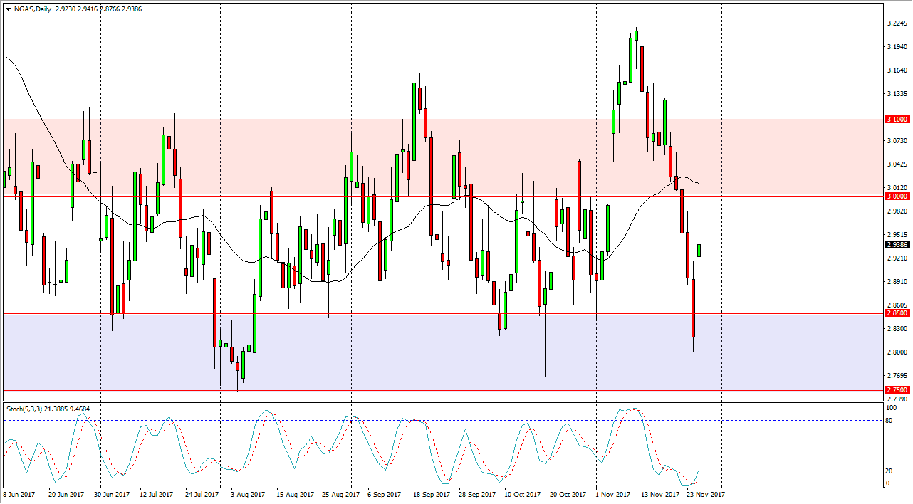The natural gas markets gapped higher at the open on Monday, pulled back to test that gap for support, founded, and then turned around to close for a hammer. This is a very bullish sign, but a break above the top of the hammer does not have me buying, rather it has me looking for exhaustion above the start selling again. The fact that we turned around the way we did and started falling tells me just how soft this market probably is underneath. Because of that, I’m waiting for signs of exhaustion above, especially near the $3.00 level, to start selling as seasonality doesn’t seem to apply this year. Quite frankly, natural gas markets are flooded with supply, and even though it starting to become colder in the northeastern part of the United States, it doesn’t seem like we can hold strong pricing in the natural gas markets.