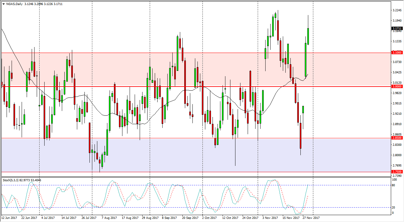 The WTI Crude Oil market had a volatile session as one would expect, because we got the Crude Oil Inventories announcement. While the headline number was very bullish, the distillate numbers were a very mixed picture, and of course the fact that a lot of the headline number was due to Thanksgiving Day driving, it’s likely that traders were starting to focus almost immediately on OPEC and the hype surrounding the idea of them possibly cutting production. At this point, it looks less likely that it once did, so it’s possible we may see more negativity. From the technical analysis point of view, we have pulled back towards the $57 level, which was previous resistance. Because of this, we may continue to see buying pressure, but at this point I think it’s easy to wait for the market to break on one side or the other of the daily candle on Wednesday to start buying or selling. I am simply going to allot the market decide which direction we go.
