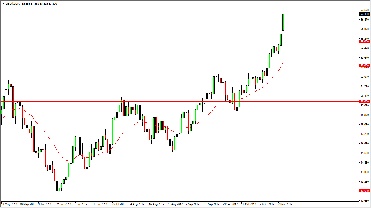 The WTI Crude Oil market gapped higher at the open on Monday, and then broke above the $57 level. Part of this was due to the purge that we have seen in Saudi Arabia over the weekend, bringing quite a bit of uncertainty when it comes to the petroleum markets. I believe that the $55 level now should offer significant support, and the pullbacks should continue to be buying opportunities. The $60 level above is the target from what I can see, as it is the large, round, psychologically significant number. We are bit overextended, but I think at this point we should continue to see a lot of buying opportunities, based upon value on dips. I think that the market should eventually calm down, and most certainly pull back as it has gotten overextended, but I think in the short term it’s likely that we will see more buying.