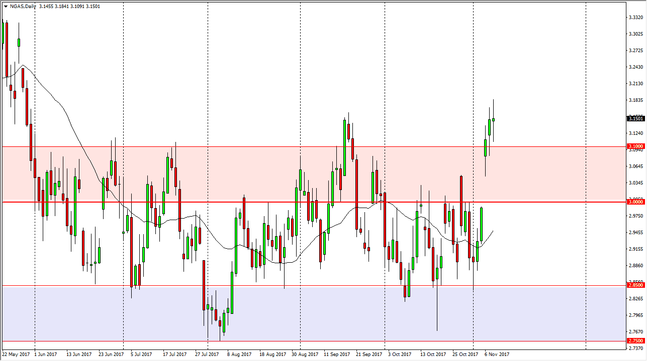 Natural gas markets continue to be very volatile, as we seem to be hanging about the $3.15 handle. A break above the top of the candle for the session is a very explosive moved to the upside just waiting to happen, but I think we are more likely to pull back towards the $3.10 level, looking for support. If we break down below there, we could go as low as the $3.00 level, which should be supportive due to the gap that appears there. It’s not until we break down below there that I am willing to start selling. The fact that we have made a “higher high”, I suspect that there are plenty of traders out there are willing to pick up dips, and perhaps try to drive this market towards the $3.30 level above. We are heading to the colder months in the United States, so it makes sense that we should continue to rally in the short term.