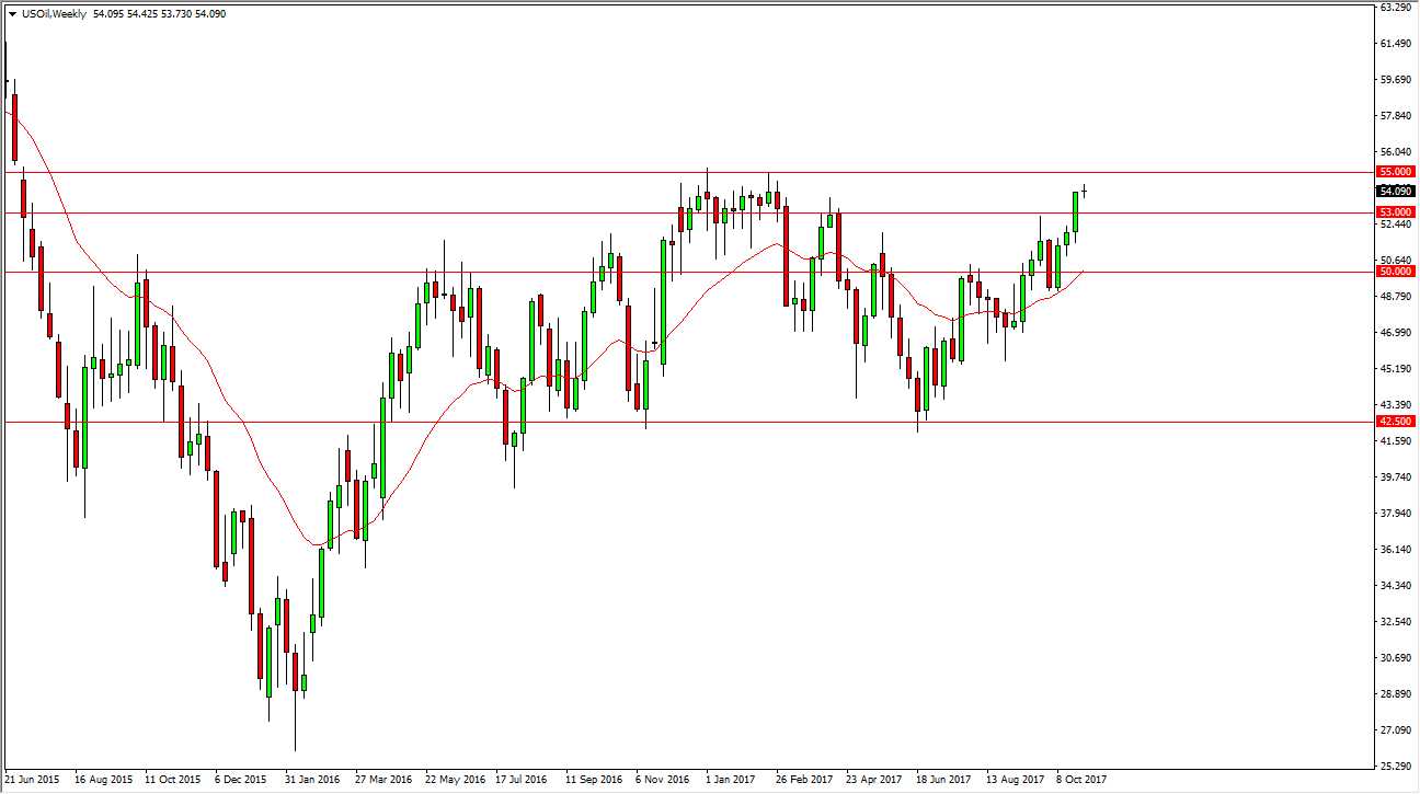 I believe that this could be a crucial month, and that being the case it’s likely that we could see a larger move based upon what happens during November. Ultimately, if we break out to the upside, I think we will see an acceleration of buying, because it would be such an obvious signal to longer-term traders. However, pay attention to the weekly chart, because if we for some type of exhaustive weekly candle, I think that we will then drop to $50. There’s a lot going on in this market, as we are talking about potential production cuts, but at the same time if the oil markets rally, it’s likely that the Americans will be more than willing to fill the void. We are going to see a lot of noise, but $55 is crucial.