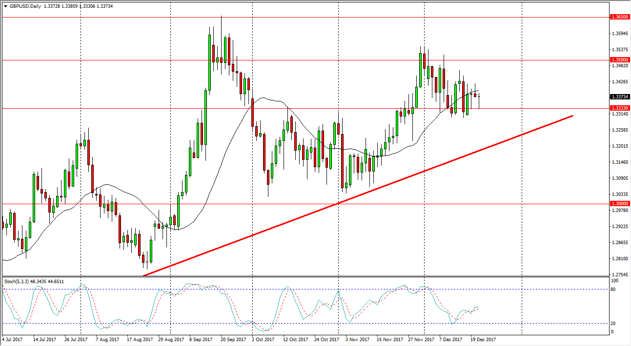 The British pound fell initially during the trading session on Thursday, but found enough support at the 1.3333 handle to bounce again, showing that we still have an upward momentum underlying the market. Looks likely that the market forming a hammer suggests that we are going to go higher, perhaps reaching towards the 1.35 level above. That is a level that I think is going to cause a bit of resistance, but eventually we will break out above there. The uptrend line is very much intact, so I think that the uptrend is intact overall. Eventually, I suspect that the market is going to go looking towards the 1.3650 level, which is a major barrier to overcome. Once we do, the British pound becomes “buy-and-hold.”