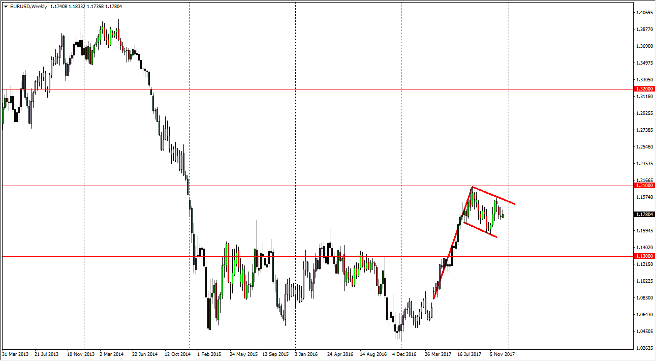 The EUR/USD pair has been volatile over the course of the last 6 months or so, but the one thing that you cannot deny is that we’ve seen a lot of bullish pressure. At one point, we had seen the market break above the vital 1.15 handle, and for me that’s a very positive sign. In fact, as you can see on the weekly chart, I have a bullish flag marked, and I think we are going to break out to the upside during this quarter. I think that we will probably see a significant amount of resistance above, particularly near the 1.21 handle, but I expect that will be broken during the first quarter.