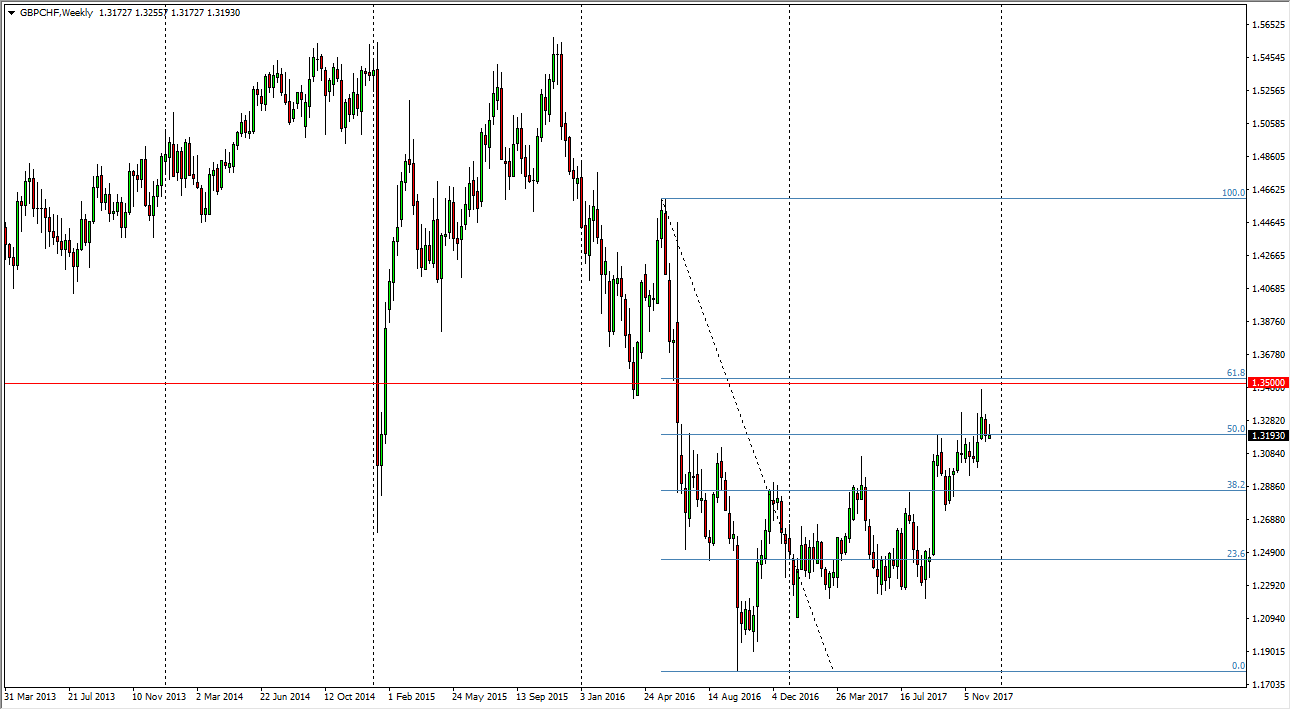 If we were to break above the 1.35 level on the weekly chart, I think that is a sign that we are going to go much higher, retracing the entire move and reaching towards the 1.46 region. Alternately, if we break below the 1.30 level, we could look for retrace to the 1.2850 level, and then perhaps 1.25 after that. This is a market that is highly sensitive to risk appetite around the world, so pay attention to that as well. That being said, the Swiss are doing everything they can to kill their own currency, with interest rates being negative all the way around. This is quite a bit of fuel for a move against the franc, and if the British pound get some type of a certainty out of the divorce from the European Union, that could be a bit of a turbo boost for this pair to the upside. Alternately, this is a likely very noisy market, so be careful and keep your trading position small. In general, I think this quarter is going to dictate where we go for the next couple of years. For my money, 1.35 above is vital to the future direction and any type of potential buying opportunity.
