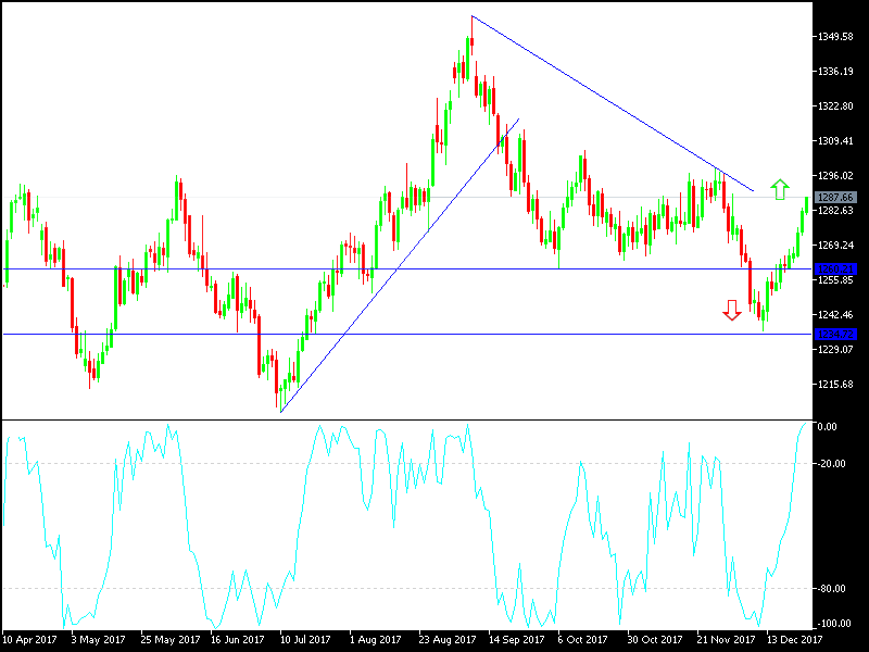 It seems that the yellow metal is trying to close the last trading of 2017 higher, as the gold prices achieved gains pushing the price toward 1280 an ounce, the highest level in the current month, and the gold is now closer to test the psychologically important peak at $1300.