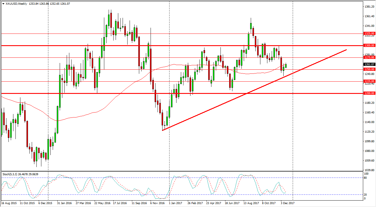 Gold markets have been a bit difficult over the last couple of months, but as you can see I have drawn a nice uptrend line that has offered support of the last couple of weeks. I think that we are going to continue to see upward pressure, and the $1300 level above will be the target. I think we will reach that sometime during Q1, and possibly even breakout above there. This has a lot to do with the US dollar, and if it continues to lose value, I think gold will rally. Pullbacks at this point should be supported, at least by the uptrend line if nothing else. Longer-term, we could reach towards the $1350 level above.