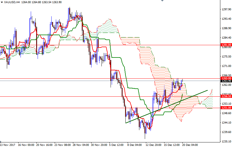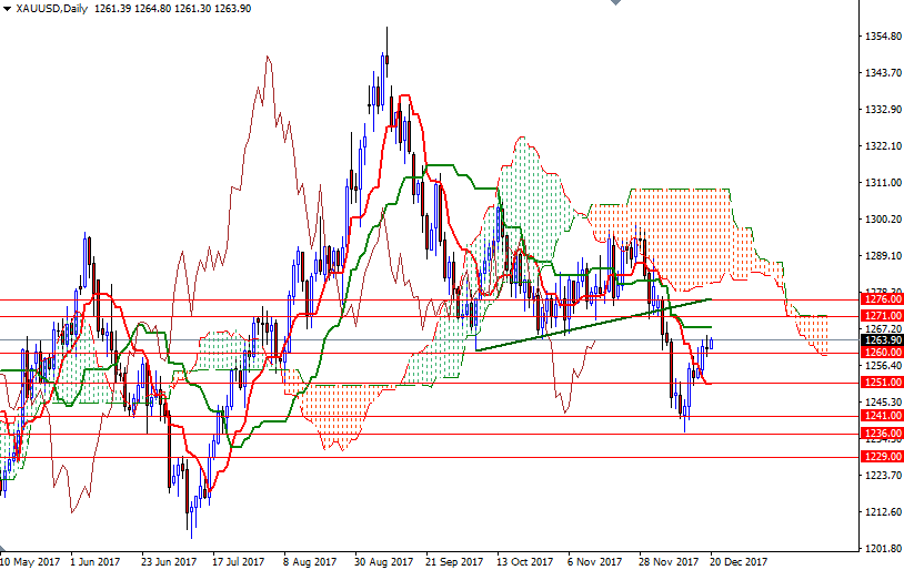 Gold prices ended Tuesday nearly unchanged, after a volatile day that saw prices swing between gains and losses. The XAU/USD is currently trading at $1263.90, higher than the opening price of $1261.39. The key levels I mentioned in my previous analysis are still valid as the market is trapped in a narrow range of around $5. Trading volumes will begin to dwindle as the week progresses ahead of the Christmas holiday.