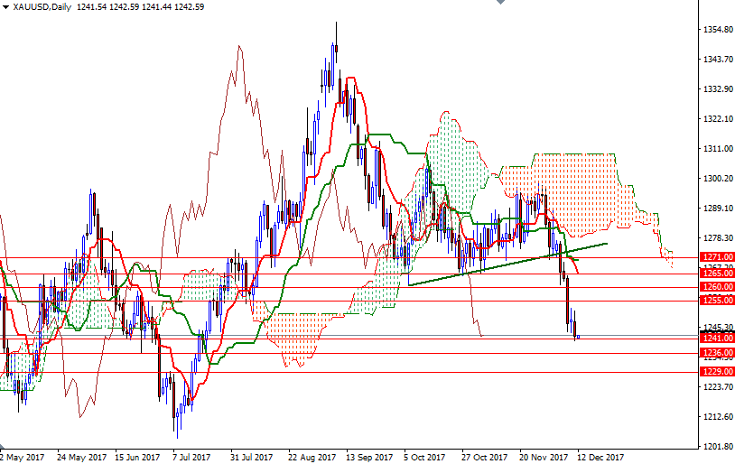 If the support at 1241 remains intact, the bulls may have a chance to revisit 1246 and 1248.20 (the bottom of the hourly cloud). Beyond there, the 1251 level stands out as a strategic point. The bulls will have to pass through 1251 to tackle the next barrier in the 1256.50-1255 area. However, if the cloud on the H1 chart continues to block the bulls’ way and the market successfully gets below 1241, then the 1236/3 area will be the next target. A daily close below 1263 (the bottom of the weekly cloud) paves the way for 1229/6.