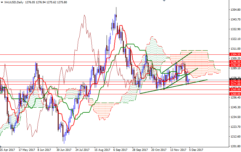 The market continues to feel pressure from the Ichimoku clouds on the daily and the 4-hourly charts. Negatively aligned Tenkan-sen (nine-period moving average, red line) and Kijun-sen (twenty six-period moving average, green line) on the H4 chart is another bearish element. Despite this outlook, the area between the 1274 and the 1271 levels has been supportive so far. In other words, the downside potential will be limited until the bears successfully drag the market below this area.