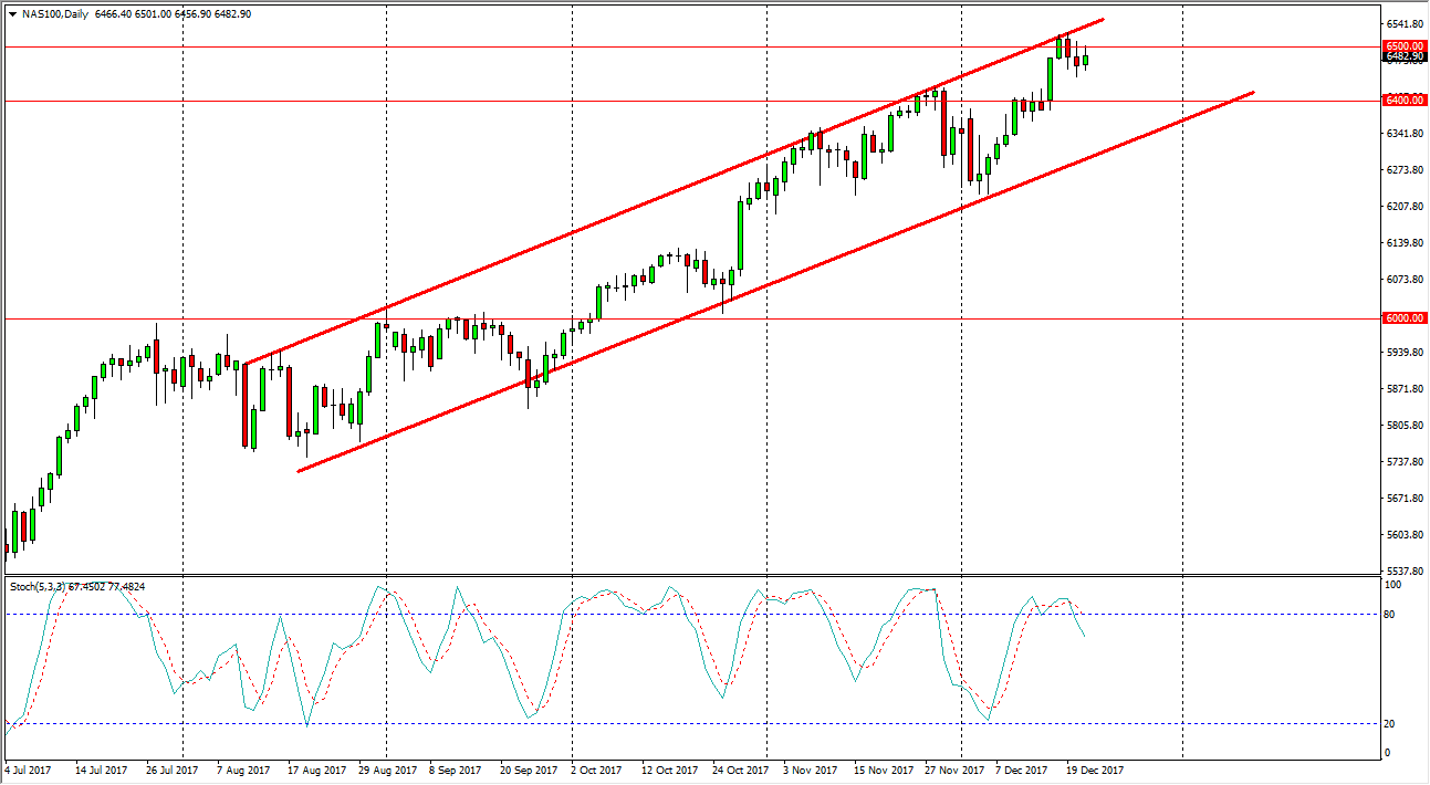 The NASDAQ 100 has been noisy during the day as well, reaching towards the 6500 level. That’s an area that has been resistive in the past, and we are reaching towards the top of an overall uptrend in channel. As we head into the holidays, volume will dry up and at this point professional traders are already on vacation. That being the case, it’s probably best to stand on the sidelines and wait until after the holidays are out of the way to put fresh sessions into the market. However, the 6400-level underneath could offer enough support to offer a buying opportunity for the short term.