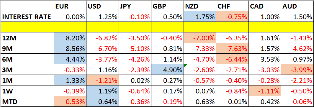 Let’s take a look at the relevant data of currency price changes and interest rates to date, which we compiled using a trade-weighted index of the major global currencies: