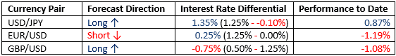 For the month of December, we forecasted that the best trades would be long EUR/USD, long GBP/USD, and long USD/JPY. The performance so far is as follows: