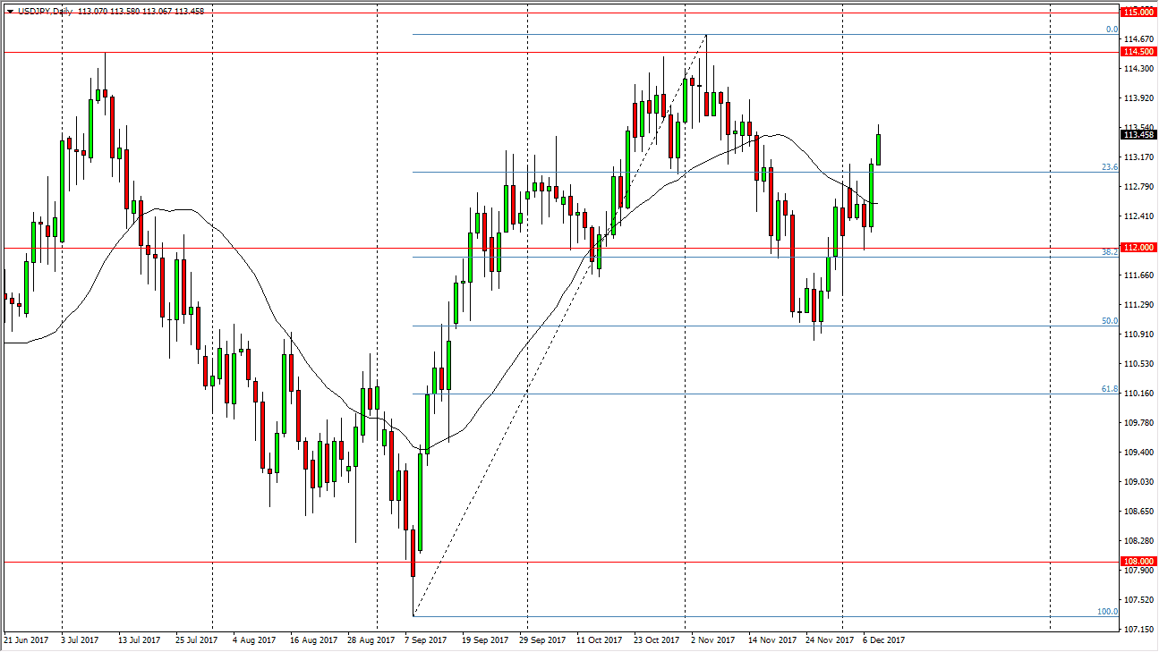The US dollar rallied significantly during the trading session on Thursday, breaking above the vital 112 level. By doing so, it looks as if we are ready to continue rallying, and if there is a tax deal coming out of the U.S. Congress, it’s likely that we will go looking towards the 114.50 level above, and perhaps even the 115 handle. If we can clear the 115 level, the market should go much higher, perhaps offering a buy-and-hold scenario. With this being the case, I like the idea of buying pullbacks, especially considering that interest rates look likely to go higher in the United States while the think Japan remains alter easy. If we were to break below the 111 level, the market should then drop to the 110 level, and then down to the 108 handle.