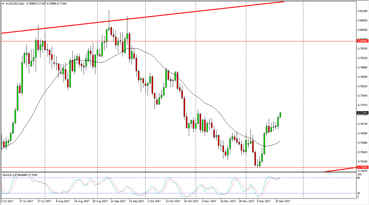 The Australian dollar rallied slightly during the trading session on Friday, but we don’t have much in the way of volume. I believe that now that we have broken above the 0.77 handle, it’s likely that the market may go looking towards the 0.79 level after that. There is a lot of noise in this market, but with gold rally in the way it has, I think that the Australian dollar will continue to be influenced by that market as well. If we can break towards the 0.80 level above, I think at that point there will be a lot of bullish pressure in the market after the breakout, but I think any signs of exhaustion will also bring in a lot of sellers. Expect a lot of noise, but in general I think that the markets will continue to be very difficult.
