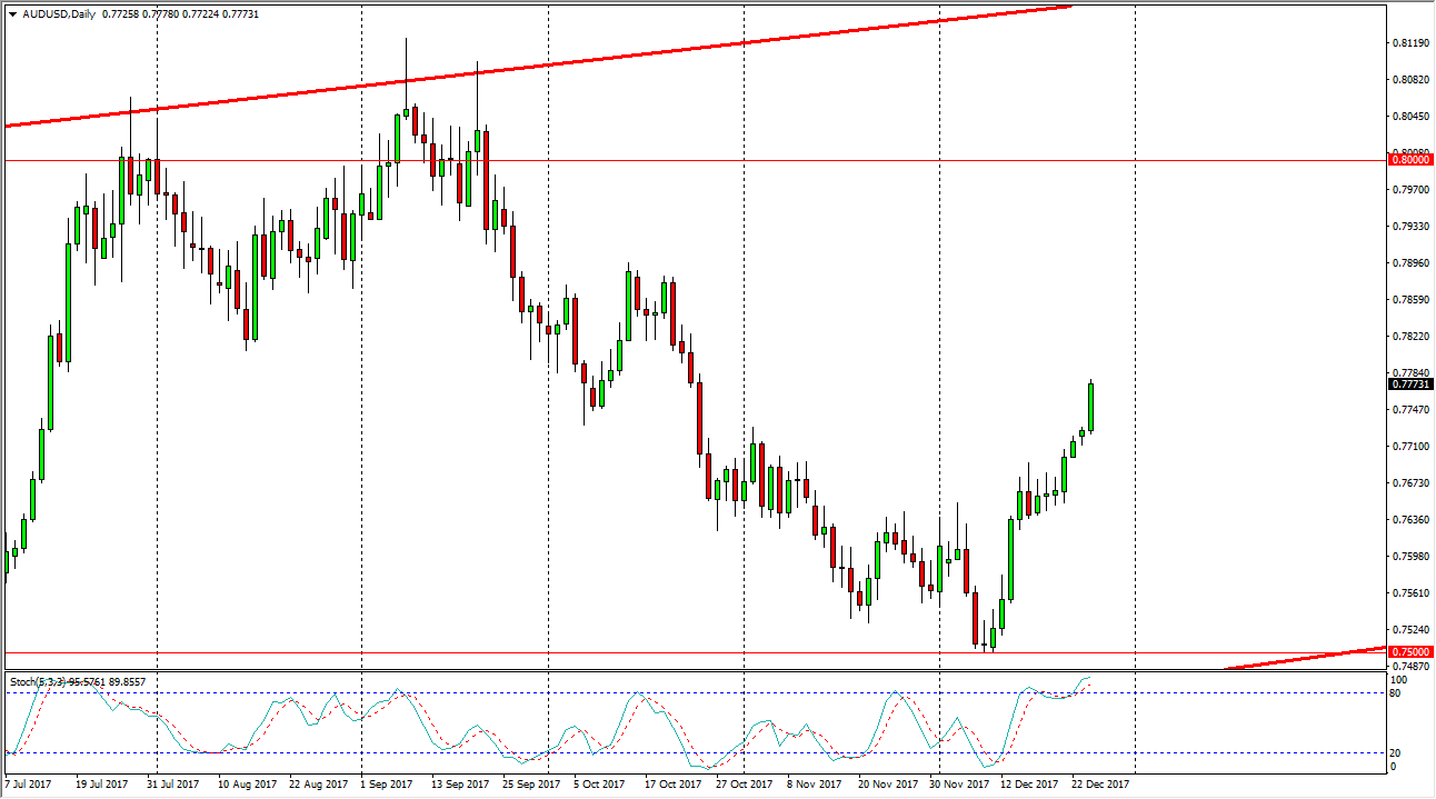 The Australian dollar broke above the 0.77 handle, and continue to go much higher during the trading session on Wednesday. Now that we have this move, it’s likely that we will continue to grind towards the upside, and potentially the 0.79 handle, followed very closely by the 0.80 level. That is an area that has been important on longer-term charts, and as a result will probably attract a lot of attention. The 0.75 level offering support underneath is a strong sign, as it was the bottom of an uptrend in channel, and of course a large, round, psychologically significant number. If we can stay above the 0.80 level for any real length of time, it’s likely that this could end up being a bit of a “buy-and-hold market”, and that will be exacerbated if gold starts to rally as well. A break above the $1300 level in the gold market would be extraordinarily bullish for the Australian dollar going into 2018.