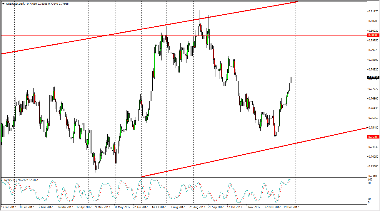 The Australian dollar rallied a bit during the trading session on Friday, but again we are in fairly illiquid environments. I think that the market is eventually going to go towards the 0.80 level above, as it is a large, round, psychologically significant number, and it is of course a number that has been very important on longer-term charts. I maintain that a break above that level and if we can stay above there on perhaps a weekly chart, then it is a “buy-and-hold” market. This is only true if the gold market rallies and breaks out as well, with the $1300 level being an area of significant contention in that contract. Until then, it’s likely that pullbacks will be short-term buying opportunities, and I think that we will get a significant amount of volatility.
