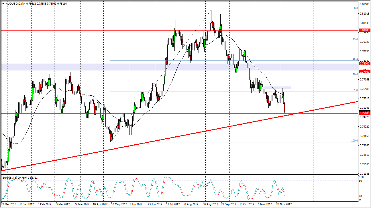 The Australian dollar fell during the trading session, reaching towards the 0.75 handle underneath. That is a large, round, psychologically significant number, but it also has a nice uptrend line dissecting it. Because of this, I think it’s only a matter of time before the buyers get involved, and on the first signs of a bounce, I think that we could have a little bit of a recovery. However, for the Australian dollar to gain for a significant amount of time, we will need to see gold markets take off as well. This would essentially be a “anti-dollar” play.