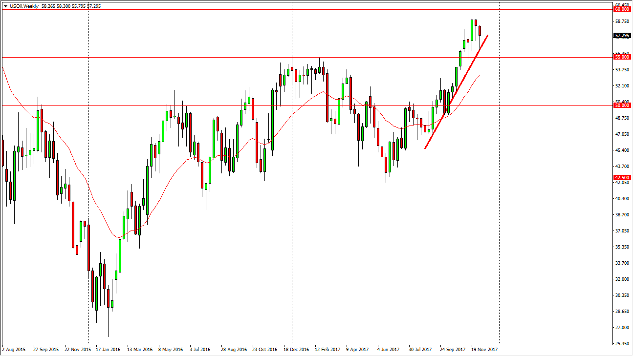 The WTI Crude Oil market initially fell during the week, but has turned around to form a hammer. The hammer of course is a bullish sign, and I think that we will see buyers jump into this market, perhaps trying to test the $60 level again. I think this is a short-term opportunity to go higher, but really at this point I think we will continue to see a lot of choppiness and essentially the market should go sideways over the course of the week. Look at short-term range bound strategies.
