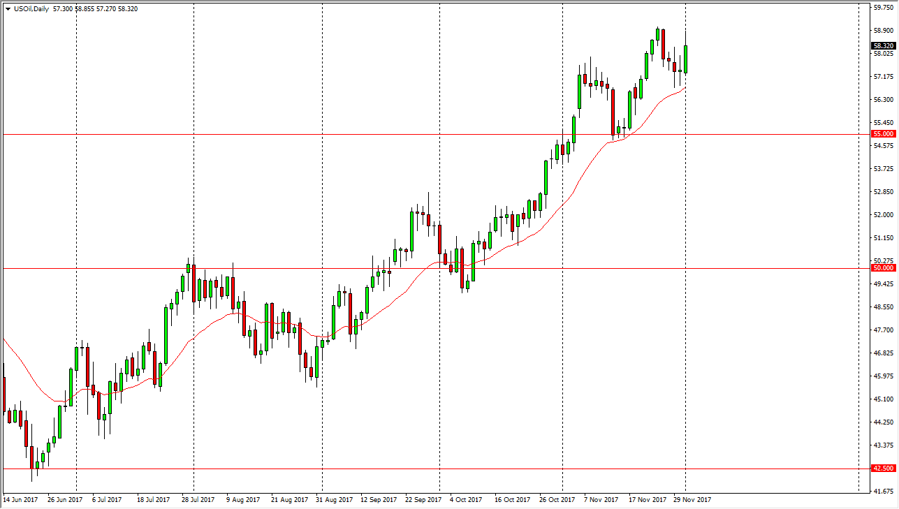 The WTI Crude Oil market rallied significantly during the trading session on Friday, reaching towards the $59 level. The $59 level is minor resistance, but the pullback I think is somewhat short-lived. The real fight is probably closer to the $60 level above, as it is a large, round, psychologically significant number. There are a lot of moving pieces when it comes to the WTI Crude Oil market, as the OPEC extension of production cuts is of course bullish, the US dollar getting hammered during the Friday session is also bullish, but we also have the specter of American drillers pumping the market with massive supply as these higher levels offer more profits. Ultimately, I think that we continue to see a little bit of a grind to the upside, but with serious complications and possibly breakdown.