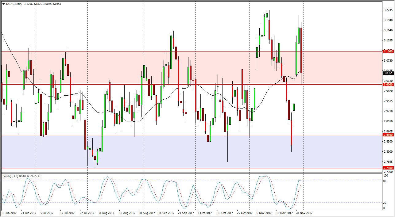 Natural gas markets had an extraordinarily negative session on Thursday, as we continue to see volatility. The $3.00 level underneath offered support, and we did bounce from there, reaching towards the $3.03 level. That being said, the market has a gap underneath that is still waiting to be filled, and it looks likely that the market may try to break down from here, but quite frankly this is the market that has been gapping from every couple of days, and it looks likely that the overall attitude of the market will shift back and forth due to weather reports coming out of the northeastern part of the United States, so quite frankly it’s almost impossible to trade this market for any length of time. At this point, I believe that sitting back or trading is all you can do.