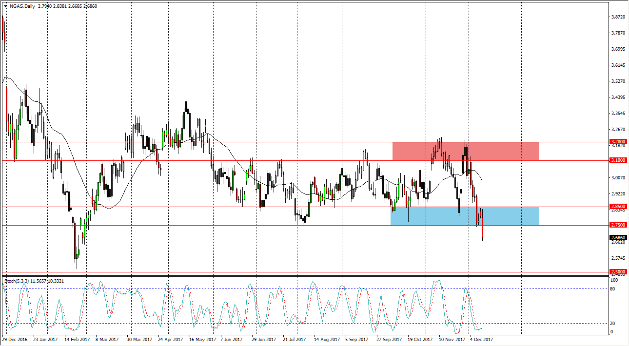 In a huge surprise to me at least, the natural gas markets tried to rally towards the $2.85 level but did something that I didn’t think what happens during the month of December: they broke down yet again. By slicing through the $2.75 level, it looks likely that we are going to go towards the $2.50 level in the longer term, but I think short-term rallies will be needed to short this market, as sudden bounces could occur in a very thin energy market. Overall, I believe that the market will find plenty of support near the $2.50 level, but needless to say the extreme amount of volatility has caught the market off guard this winter, as we typically have buying pressure this time year, but clearly that has not panned out very well for the buyers. Keep your position size very small.