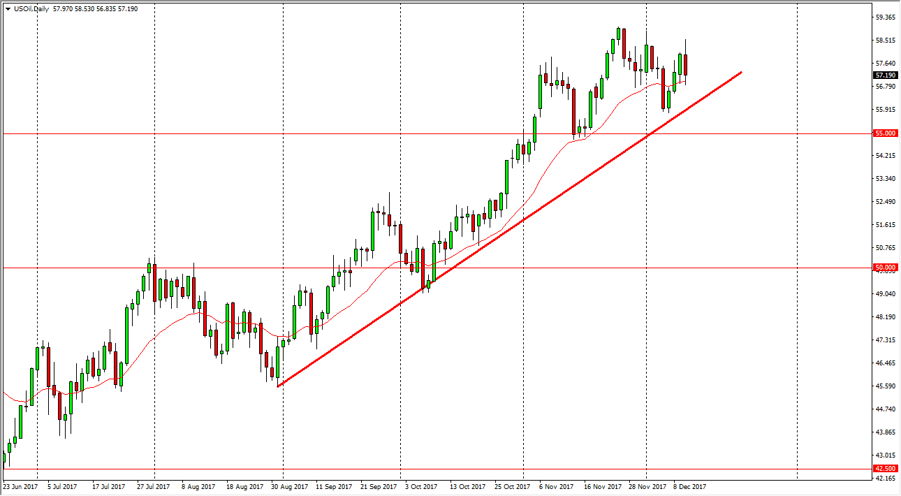 The WTI Crude Oil market initially tried to rally during the trading session on Tuesday, but rolled over as the market plunged towards the $57 handle underneath. If we can break down below here, I think that the market is probably going to test the uptrend line just below, so I think that more softness may enter the marketplace, but ultimately, it’s not until we break down below the $55 level that I would be concerned about the uptrend. In the meantime, I think you are going to need to see some type of bounce below to take advantage of a continuation of the uptrend. Because of this, patience will be necessary going forward, especially considering that the Federal Reserve will have a massive effect on the US dollar today.