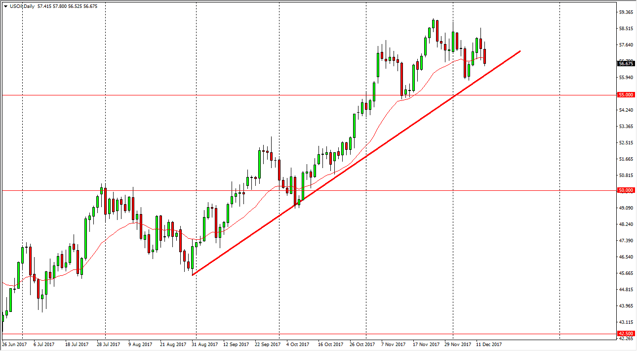 The WTI Crude Oil market initially tried to rally, but then rolled over the show signs of exhaustion during the day on Wednesday. There is a nice uptrend line just underneath, so that should be a nice buying opportunity, so waiting for a supportive candle is reason enough to go long. However, if we were to break down below the $55 level, I think that the market should send this market down to the $52.50 level below, which should be the next support level. I think volatility continues to be a major issue in this market, so we will have to see whether we can continue the uptrend, but I believe that the $60 level is essentially the ceiling in the market as the oversupply of petrol will continue to be an issue. Keep your position size small.