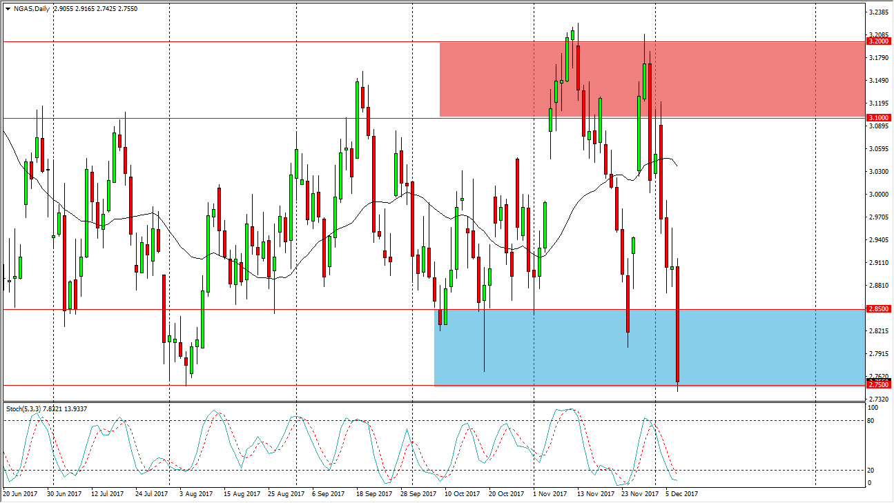 Natural gas markets have reached towards the $2.75 level, but are starting to show signs of support. If we break down below the lows of the trading session, natural gas could go a bit lower, but quite frankly I think we will more than likely see a turnaround as it has been so oversold in this general vicinity. We have been here before, and have consistently seen buyers jump in near this area. In the short term, you might be noisy, but I believe a bounce from here is reasonable to expect. If we did breakdown significantly, we would then go looking towards the $2.50 level underneath for support, which of course has not only structural support, but it also has a significant psychological aspect to it as well. A break above the $2.85 level sends this market looking for the $3.10 level. Either way, it’s going to be choppy.