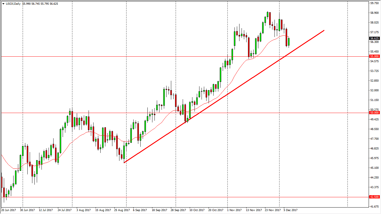 The WTI Crude Oil market bounced slightly during the trading session on Thursday as we continue to see volatility in the crude oil complex. There are various factors going on at the same time in this market, not the least of which will be the OPEC production cuts, and of course the high evaluation of oil attracting American drilling. In general, we have a jobs number coming out during the day could have a massive influence on what happens with the US dollar, and of course the perception of demand going forward. I believe that the $55 level underneath is massively supportive, so a pullback to that area will more than likely find buyers willing to take advantage of value at that lower level. If we break down below the $55 level though, the market could breakdown to the $53.50 level.