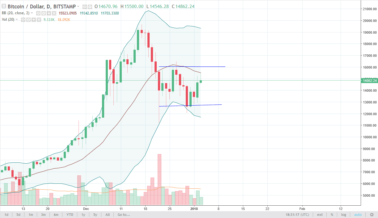 Bitcoin initially rallied during the trading session on Wednesday, but ran into a significant amount of resistance at the $15,000 region. As you can see, we are testing the middle of the Bollinger Bands indicator, the 20 SMA. I think that we pull back from there, showing a sign of extreme weakness in forming the shooting star. The shooting star suggesting that we are probably going to go down below the bottom of the consolidation area, perhaps reaching towards the $13,000 level underneath. I believe that a breakdown below the bottom of the shooting star is the signal, as it is a negative sign in a market that has been rolling over. However, if we can break above the $16,000 level, then I think the market could continue to go higher, perhaps reaching towards the $20,000 region over the longer term. Short-term though, the initial target would be the $18,000 level.