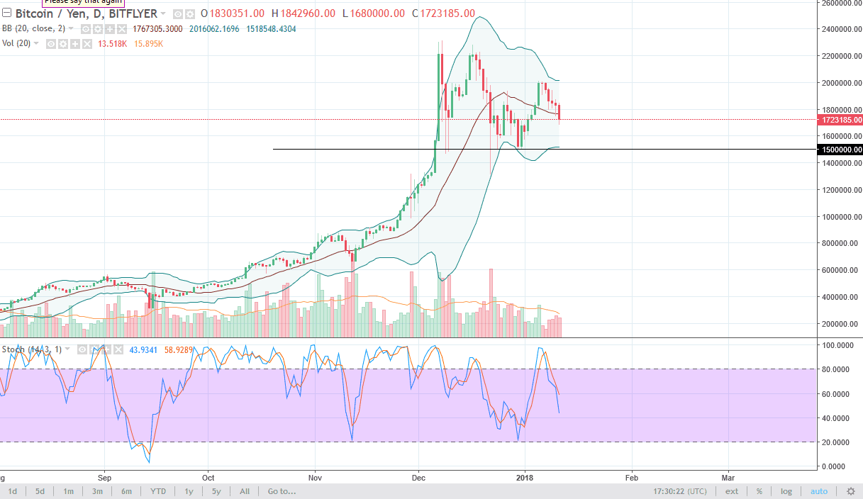 Bitcoin fell against the Japanese yen, keeping some of the losses later in the day. This makes sense, because the Japanese yen itself has been strong in the Forex markets, which of course are much more influential when it comes to global finance and of course volume. The ¥1.5 million level underneath looks to be a target, and I think that is where we are going to end up. When you look at the previous 2 candles, we had a shooting star and a hammer. Both have been broken down, and now it looks like the sellers are in control. I would expect a significant amount of support at the ¥1.5 million level though. Because of this, I think this is a short-term selling opportunity, but is not until we break down below the ¥1.4 million level that I would become aggressively short. I would anticipate that there should be some type of bounce near the ¥1.5 million level, as history has shown more than once.