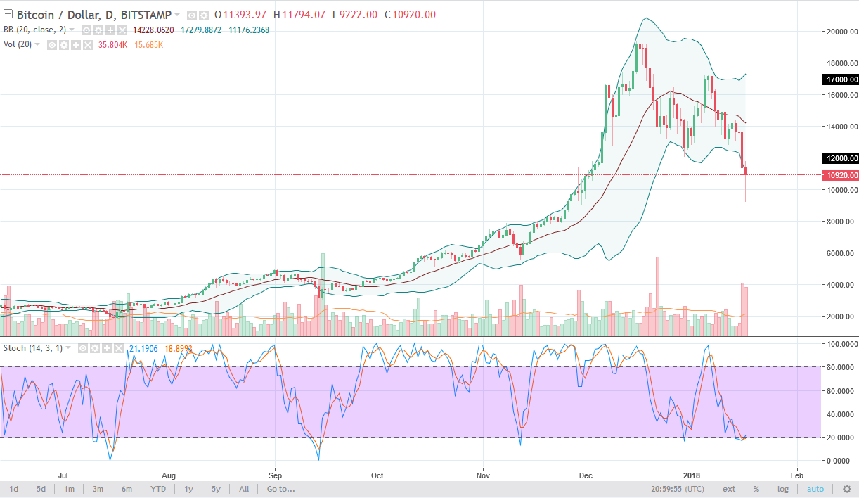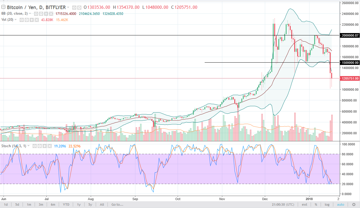 Depending on where you are the world, you may or may not pay attention to how Bitcoin trades against the Japanese yen. If you do not, that’s a huge mistake as the largest traders of Bitcoin are in Japan. In fact, some estimates are as high as 40% of global trade. Asia has lead the way for massive selling as of late, so the biggest problem that you will have is that a simple headline out of either South Korea or Japan, or even possibly China, could send this market right back down. We did test the vital ¥1 million level, and so far it has held, but at the end of the day I think there are a lot of nervous traders out there. A breakdown below the ¥1 million level is a significant break down, and could lead to an unwinding of the entire uptrend that the market had seen. At the very least, we have done massive amounts of damage to the psyche of the retail trader.