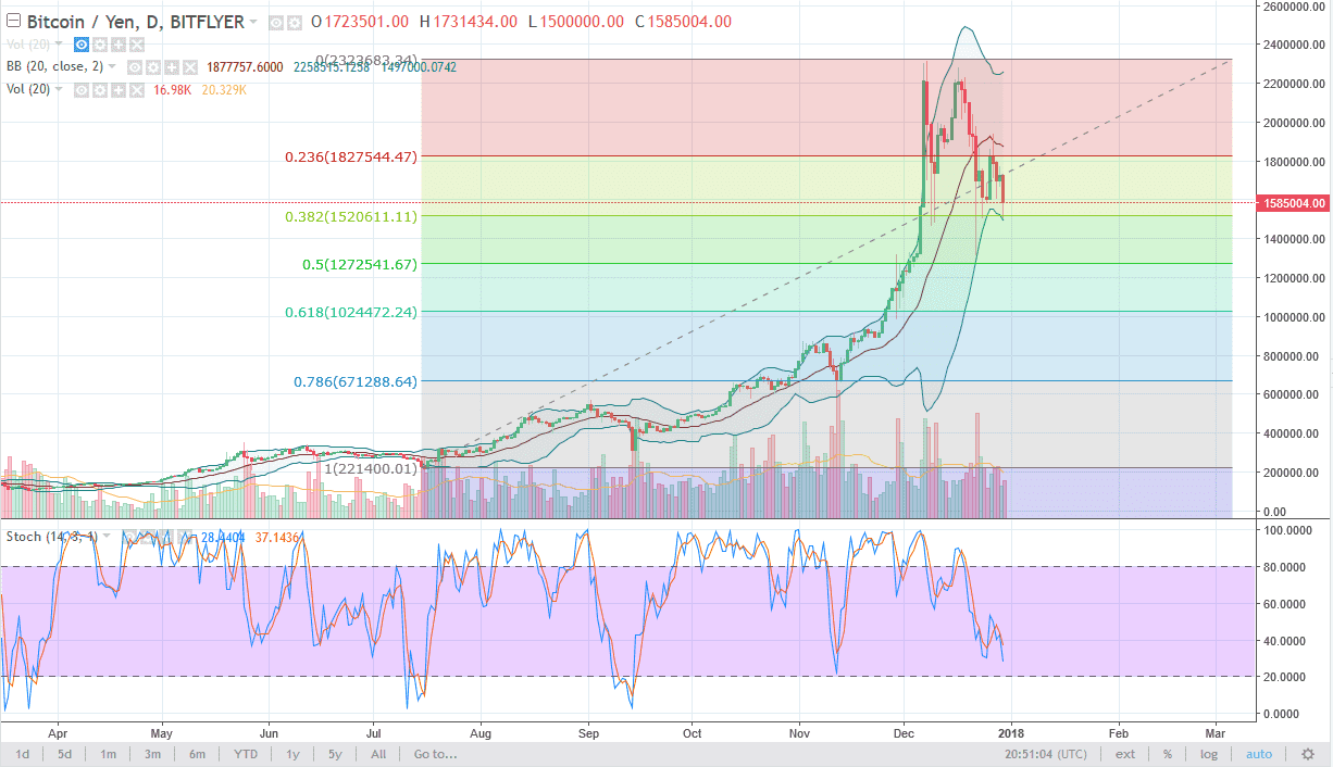 Bitcoin also is starting to roll over against the Japanese yen, which of course is a very negative sign as Japan is roughly 40% of all Bitcoin trading volume. Because of this, I think we are seeing a bit of a cooling off of the Bitcoin market, and I think it’s likely that we could go down to the ¥1.2 million level, or perhaps even the ¥1 million level. We really haven’t had much of a pullback after the massive rally, and you can see that we had most certainly gotten to be a bit parabolic. Because of that, this should be a healthy pullback that you can take advantage of. I would wait until we get a supportive candle underneath or better yet, and oversold condition on the stochastic oscillator and a cross, telling us that the buyers should come back into the market. When you do enter the market, do so slowly as you should have plenty of time.