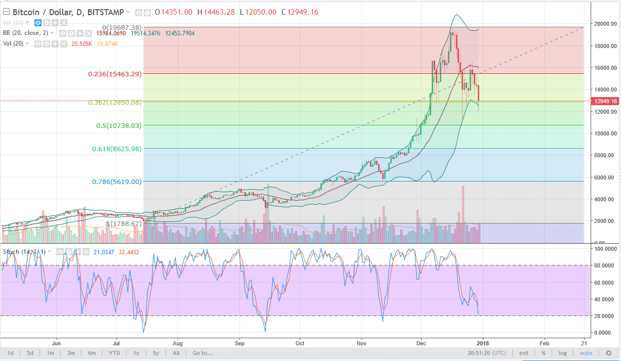 Bitcoin traders have sold over the last couple of sessions, as we are below the $13,000 level at the time of this recording. It is the 38.2% Fibonacci retracement level of the recent move on the daily chart, but I think we are bound to go much lower. The 50% Fibonacci retracement is at the $10,700 region, and the 61.8% Fibonacci retracement level is closer to the $8700 level. I think that we are likely to see at the very least the 50% retracement level tested. The 20 SMA is starting to roll over, and it’s likely that we will continue to see selling pressure, at least in the short term. The stochastic oscillator is very negative, and I would be the first point out that the most recent heavy volume candle on the daily timeframe was decidedly negative.