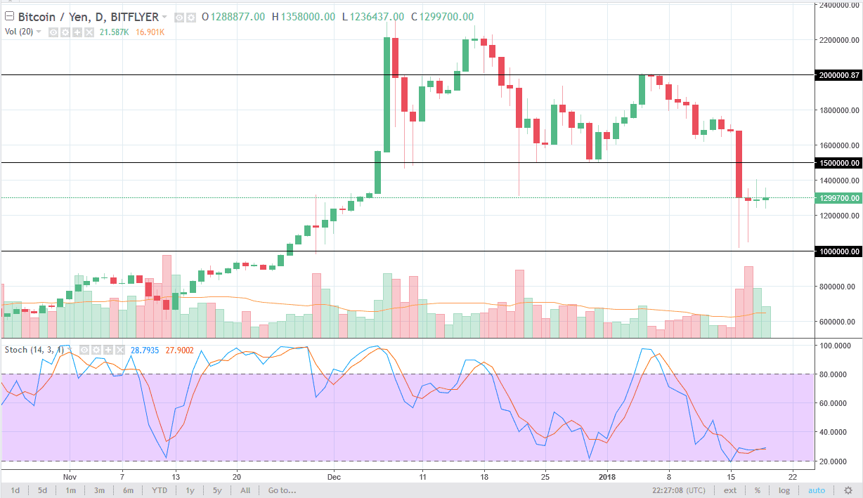 Bitcoin went back and forth during the trading session on Friday, forming a neutral candle. Again, the volume is relatively anemic, but stronger in Japan. That makes a bit of sense, 40% of all volume is done in Asia, and most of that in Japan itself. However, it’s obvious that we do not have enough confidence in the market to continue to grind higher, and the ¥1.5 million level will more than likely continue to be a barrier. The ¥1 million level underneath is massively supportive, so I think in the meantime we are looking at consolidation between those 2 levels.