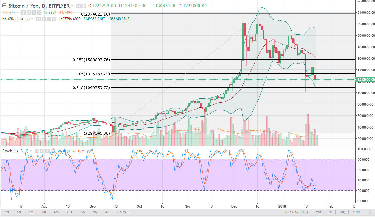 Bitcoin also fell against the Japanese yen but has found a bit of support near the 61.8% Fibonacci retracement level to form a hammer. Volume is still reasonably low though, and most certainly you can see that there is much more volume on the negative candles. Because of this, I anticipate that this rally will fail, and I am not convinced until we can break above the 1.5 billion in level at the very least. Even then, I need to see volume to get involved to the upside. Alternately, if we break down below the ¥1 million level, the market probably falls apart and goes looking towards ¥300,000, wiping out the gains from the last year or so, which of course has gotten ahead of itself. Either way, I suspect that a lot of the mania surrounding Bitcoin is dying before our very eyes. Most retail traders who have gotten in during the height of that mania have already lost roughly 45%.