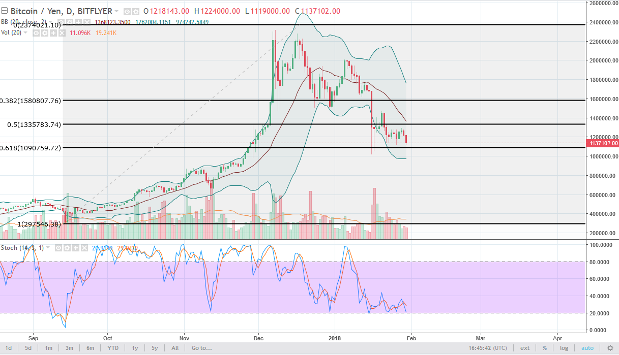 Bitcoin fell against the US dollar again on Tuesday, reaching towards the 50% Fibonacci retracement level, and the psychologically important $10,000 level. While a lot of Bitcoin proponents are making a big deal about the $10,000 level holding as support so far, those of us who specialize in technical analysis understand that even though the $10,000 level has held as of now, volume is dropping. That dropping volume is not a good sign. Accumulation means just that, people were accumulating. With no volume to speak of, and with that volume dwindling, that tells me there is no accumulation, and that if we get some type of sudden negative reaction, the market is going to break down. If it does, anticipate a move to the $8000 level. In the meantime, it volume remains very low as it has been, rallies are to be sold.