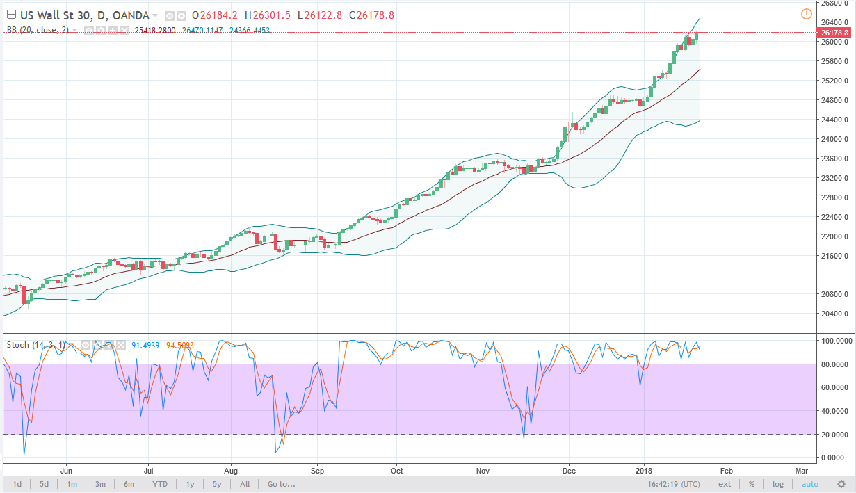 The Dow Jones 30 initially tried to rally during the trading session on Tuesday but found itself a bit overextended. This makes sense, we have gone straight up in the air over the last month, and therefore we need to see some type of pullback to offer value for traders. I think that the market will eventually find value underneath, so if you are patient enough, you should be able to profit from the value that would be offered underneath. I believe that the 25,000 level is now the “floor” in the market, and I think that the markets will respect that level if we pull back. I would be surprised if we got that low, but certainly that would be my line in the sand. Longer-term, I believe that these dips will be looked at in the past as value opportunities, as the US stock market has been so strong.