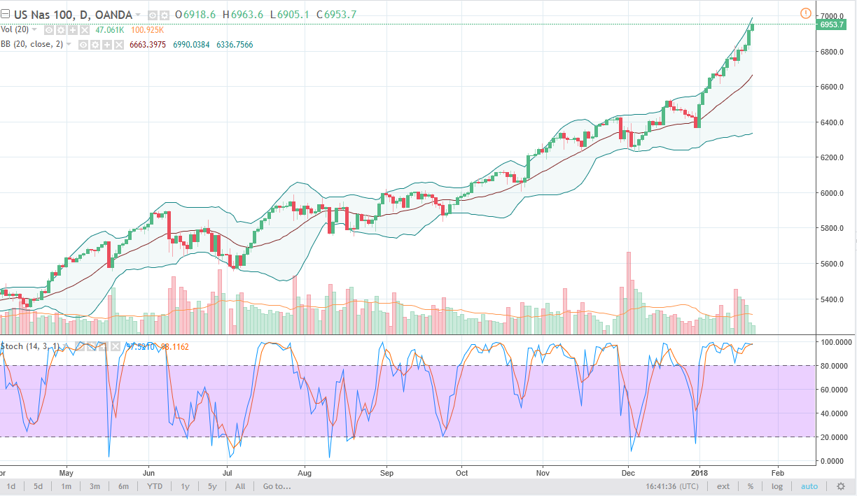 The NASDAQ 100 has rallied a bit during the trading session on Tuesday, reaching towards the 7000 handle above. That is a large, round, psychologically significant number. That of course is a target, and I believe that a pullback will more than likely offer value that people are willing to take advantage of. The NASDAQ 100 is getting a bit overstretched though, so I would like to see pullbacks to offer opportunities to get long. If we break above the 7000 handle, we could go a lot higher, and I expect that to happen eventually. However, the market is getting a bit parabolic, especially since the New Year’s celebrations.