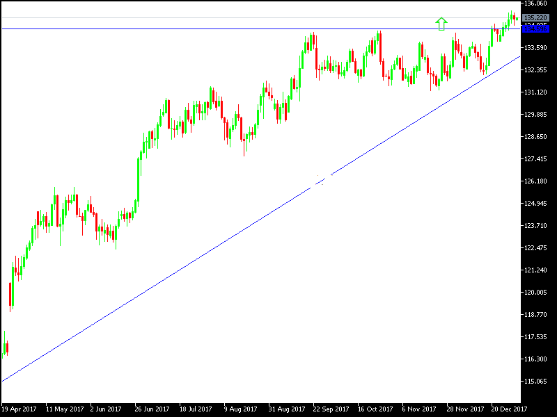 The EUR/JPY is established around 135.60 level for the 4th day in a row, which created a cluster threatens to have a corrective moves of profit taking at any time, leading to a drop in this pair. The pair is still awaiting stronger stimulates to continue the bullish move which took this pair to its highest levels since October 2015, that is more than 2 years, in light of more risk-on sentiment among investors with the USD dropping, and the investors starting to interact with the market after the holidays, in addition to comments from the ECB’s head around the near end of the bank’s stimulation plans, entering in the race of tightening policies with other central banks. We highlighted in previous analysis that the upward chance is still technically the strongest for the EUR/JPY, as shown on the daily chart. The pair ignored the political worries with the victory of pro-independence parties in the recent Catalonian elections. The EUR/JPY is still the pest performing pair of the JPY, with increased risk appetite, especially with the passage of the US tax cut law.